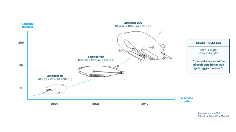 Because Airlander’s lift comes from both buoyancy and aerodynamic shaping, Airlander’s payload capacity increases faster than its size: small increases in dimensions unlock substantial gains in useful load while reducing cost per kilogramme of payload carried.